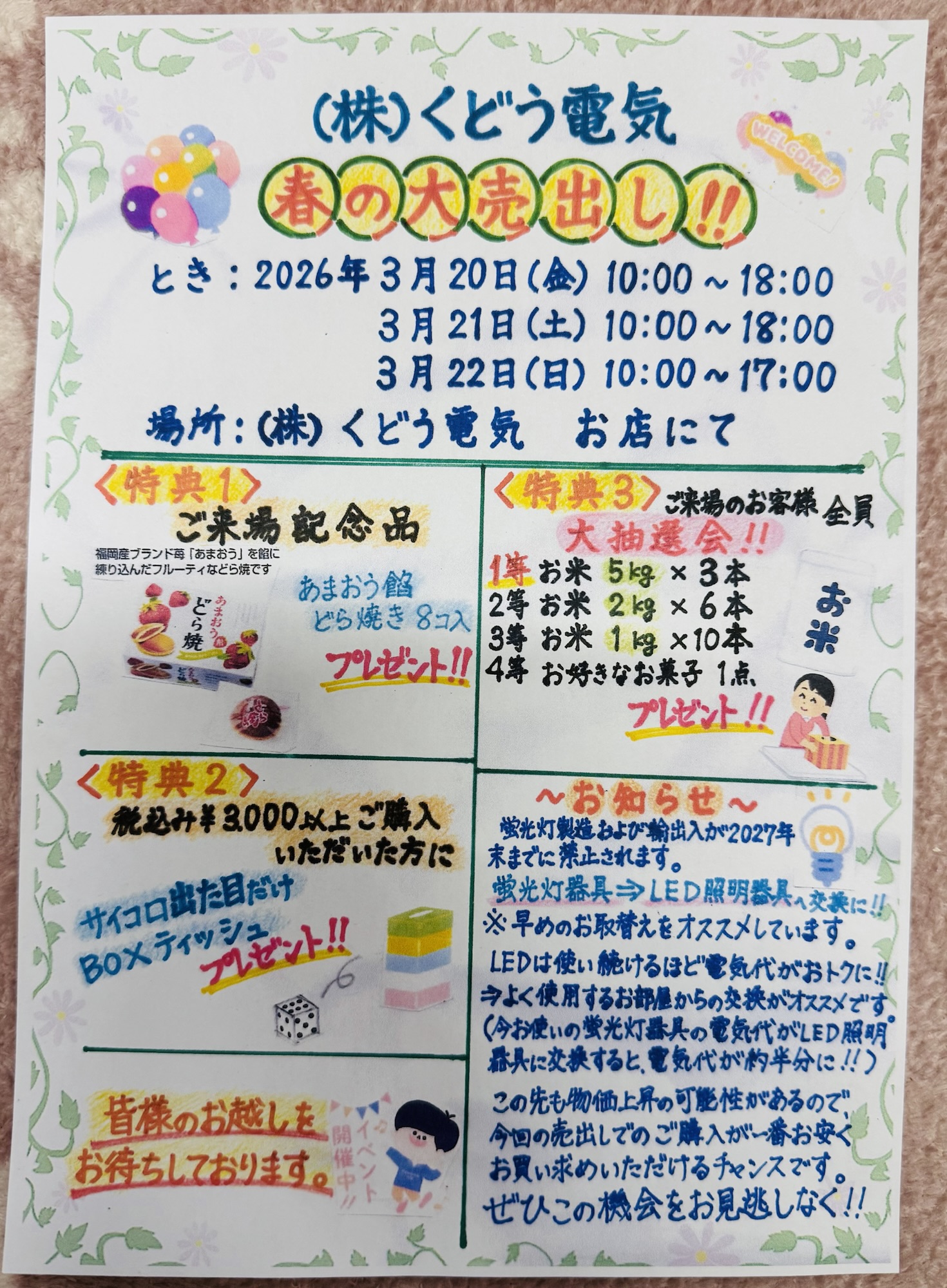 春の大売出し!!イベント続きを読むK様 エアコン取付け工事小谷野店長のブログ続きを読むT様 トイレ換気扇、エアコン取り付け工事小谷野店長のブログ続きを読むM様 センサーライト取付け、防水コンセント増設工事小谷野店長のブログ続きを読む くどう電気でできること 補助金・キャンペーンなど パナソニック公式サイト 〒357-0062 飯能市永田102-1-105 株式会社 くどう電気